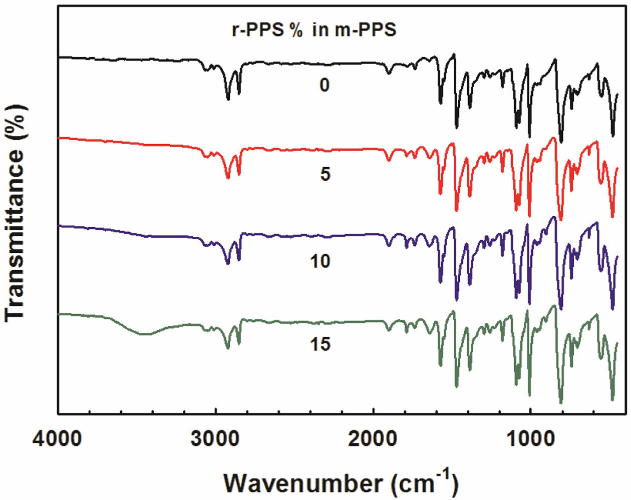 Figure 9 FTIR spectra of the m-PPS/m-POE blends at different rPPS contents. |
