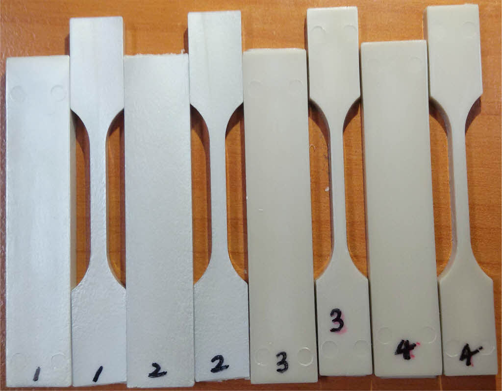 사출하였고 그 사진을 Figure 10에 도시하였다. 번호는 순서대로 m-PPS중 r-PPS 함량이 0, 5, 10, 15%(Table 1의 Lot#1, 2, 3, 4 참조) 인 것을 나타낸다. 육안으로 보아도 알 수 있듯이 전체적인 색깔이 r-PPS가 첨가됨에 따라 갈색화되는 것을 볼 수 있다. 그림에서는 확인이 어렵지만 표면의