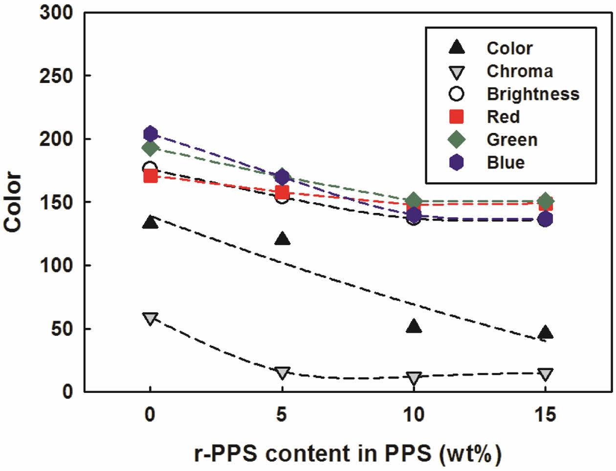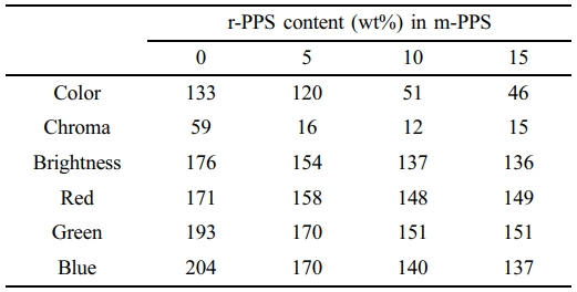 Spectro-photometer를 이용하여 측정한 표면 색상을 정량화하여 Table 4에 정리하였다. 색상, 채도, 명도, R, G, B 값 모두 r-PPS가 첨가됨에 따라 감소하는 것을 알 수 있다. 이는 r-PPS가 열에 약하여 분해되었기 때문이라고 사료되었다.