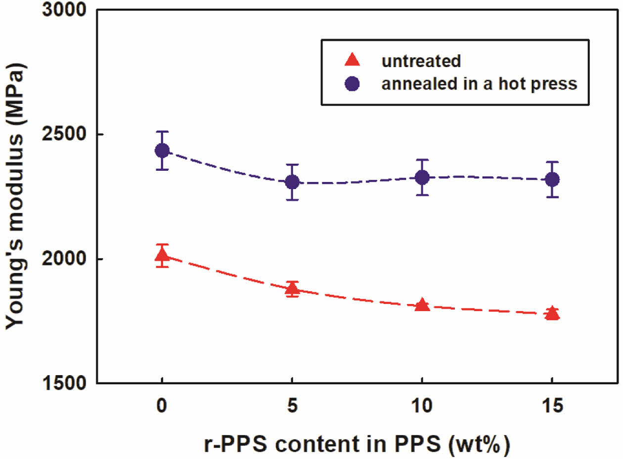이상의 기계적 특성의 결과를 요약하면 m-PPS/m-POE 블렌드의 Young’s modulus, 인장강도, 파단신율 등 인장특성은 r-PPS 함량이 증가함에 따라 약간 감소하였고 annealing 처리를 한 시편의 경우 더 큰 값을 보였다. 이는 r-PPS의 약한 aliphatic 부분 때문으로 사료되었다. 반면에 충격강도의 경우 matrix에 r-PPS가 5-10 wt% 포함될 때 충격강도의 급격한 향상을 보였고 annealing을 한 경우 더욱 현저하였는 바 이는 계면접착력에 기인하는 것으로 판단되었다.