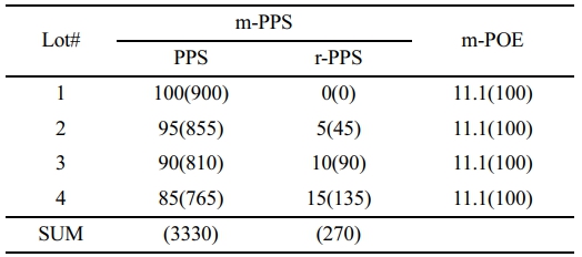 블렌드의 제조. r-PPS 펠렛을 neat PPS 펠렛과 단순혼합(dry blending)하여 제조한 개질 PPS(이하 m-PPS)를 기준으로 하였다. 기본적으로 블렌드는 m-PPS/m-POE(90 wt%/10 wt%) 조성으로 고정하였으며 m-PPS를 구성하는 neat PPS와 r-PPS의 비율을 변화시켰다. 엘라스토머 함량을 10 wt%로 고정한 것은 충격강도 향상을 관찰하기 위한 일반적인 배합으로 그 효과와 비용을 고려하여 선정하였다. 각 Lot는 혼합물 1 kg을 기준으로 하였다. 혼합비는 Table 1과 같다. 숫자는 상대적인 질량비이고 괄호 안의 값은 실제 투입된 질량(g)이다. 용융 혼련 장비는 volumetric feeder가 장착된 15 mm twin screw extruder (L/D = 40) (Bautek, 대한민국)를 사용하였다.