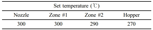 압출기로 용융혼련하여 블렌드를 압출한 후 미니 사출기(Boy, XXS, 63 kN, 독일)를 사용하여 미니인장 시험편(ASTM D638 Type V)과 충격 강도 시험편(ASTM D256, 63.5×12.7× 3.2 mm)을 제조하였다. 압출 조건과 사출 조건을 Table 2와 Table 3에 각각 정리하였다.