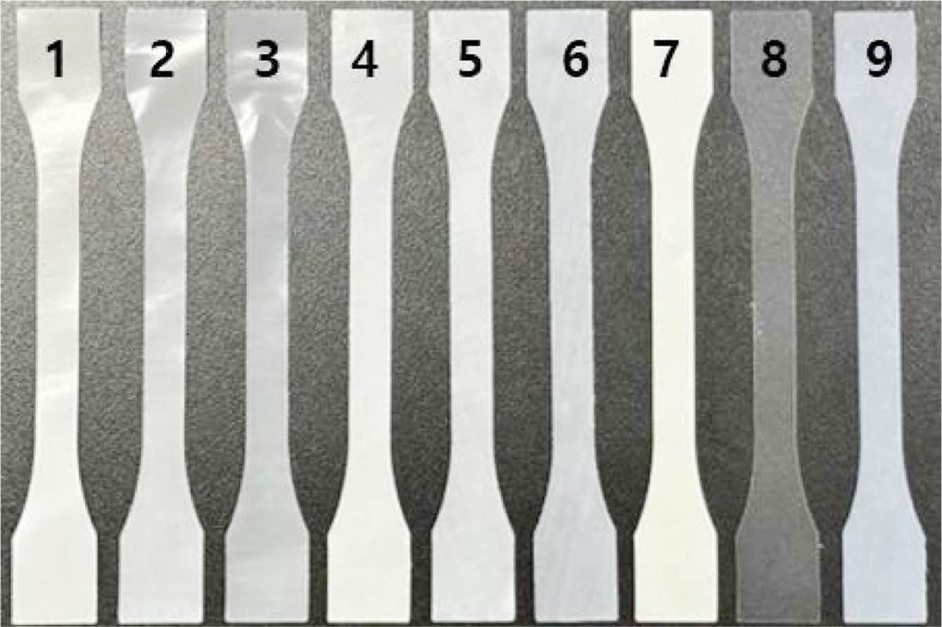 Figure 1 Photographs of dog-bone shaped specimens (ASTM D638 type) used for tensile property evaluation. Each specimen is labeled with a number (1–9) and corresponds to a different PHBV-based blend composition as follows: (1) PHBV/PLA (75/25 wt%); (2) PHBV/PLA (50/50 wt%); (3) PHBV/PLA (25/75 wt%); (4) PHBV/PBS (75/25 wt%); (5) PHBV/PBS (50/50 wt%); (6) PHBV/PBS (25/75 wt%); (7) neat PHBV; (8) neat PLA; (9) neat PBS. |