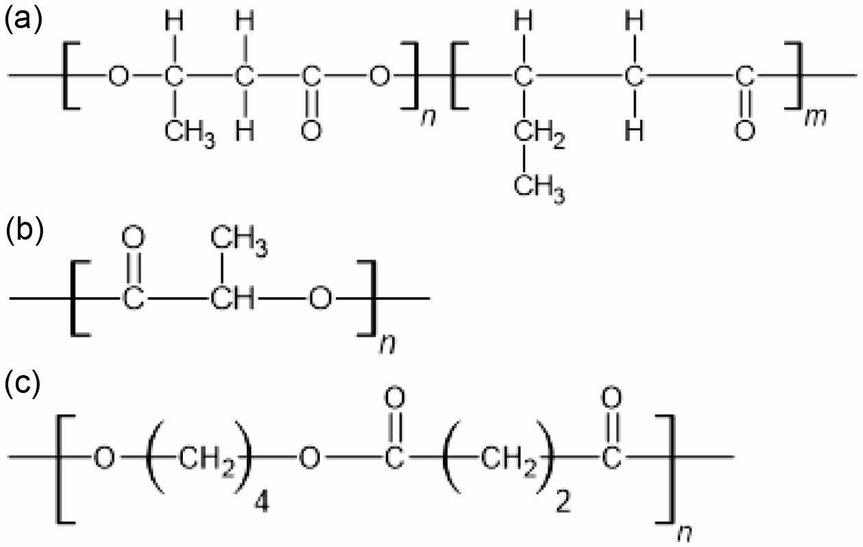 Figure 2 Chemical structures of (a) PHBV; (b) PLA; (c) PBS. |