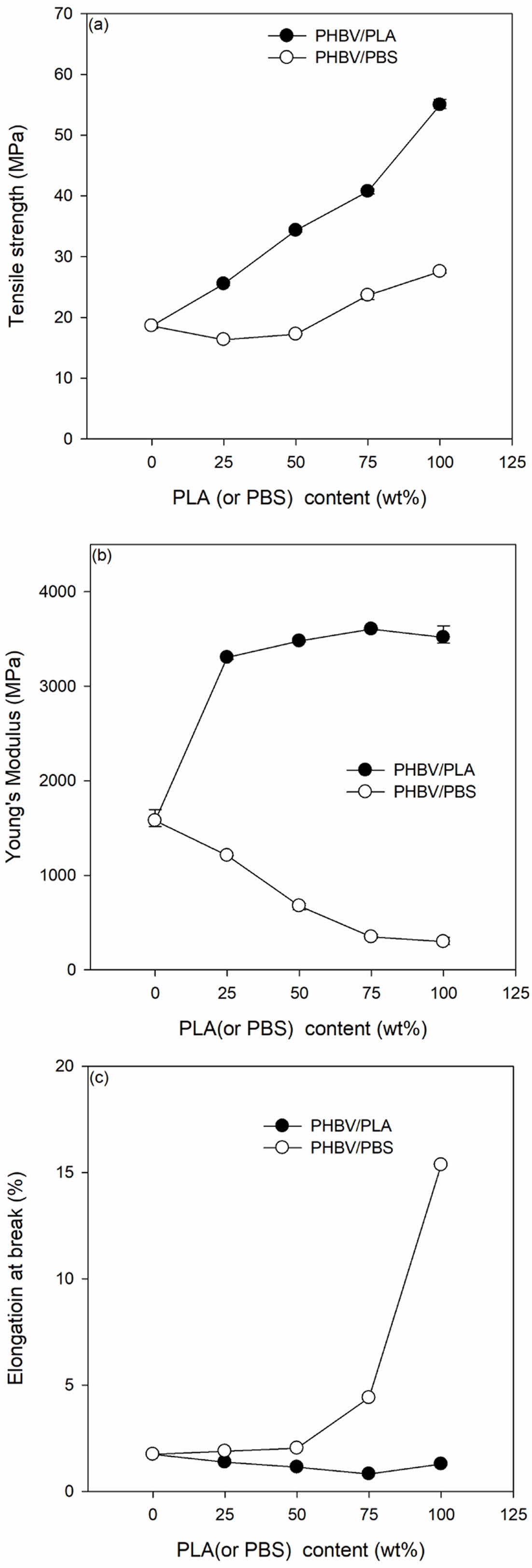 Figure 3 Mechanical properties of PHBV/PLA and PHBV/PBS blend polymers: (a) tensile strength; (b) Young’s modulus; (c) elongation at break. |