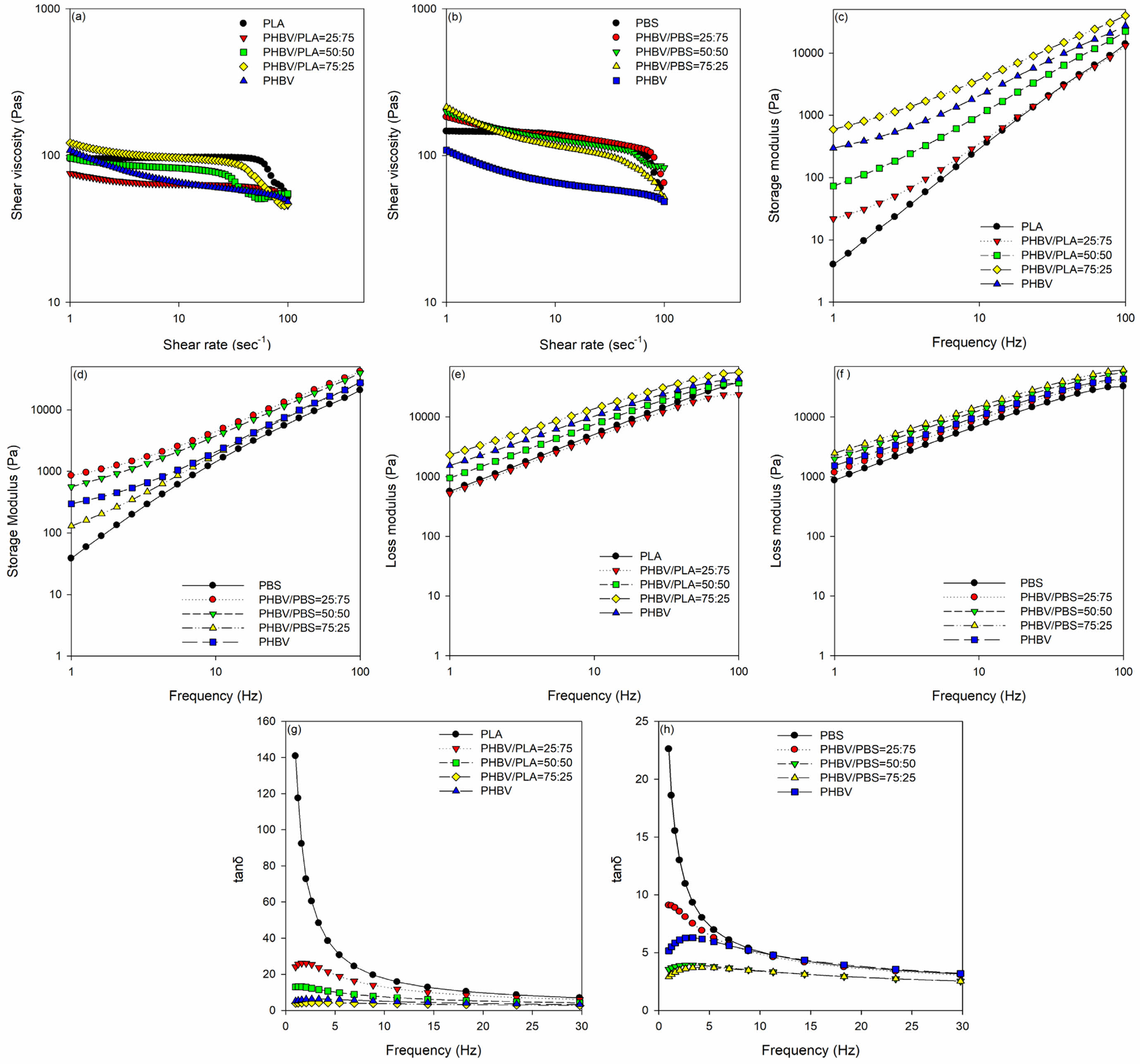 Figure 4 Rheological properties of PHBV/PLA and PHBV/PBS blend polymers: (a, b) shear viscosity; (c, d) storage modulus; (e, f) loss modulus; (g, h) loss tangent. |