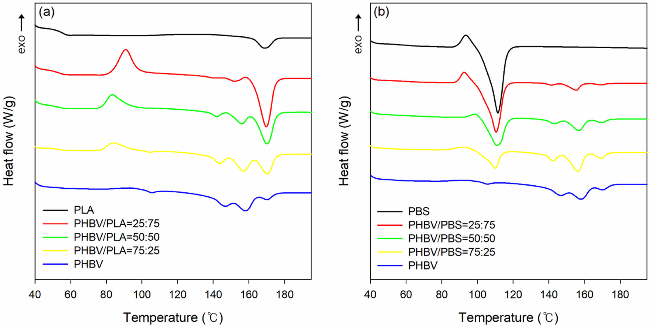 PHBV/PLA 블렌드에서는 PLA 비율이 증가함에 따라 170 ℃ 부근의 PLA 결정 용융 피크가 커지는 것이 관찰되었다. 특이한 점은 PLA 함량 증가에 의해 90 ℃ 부근의 결정화 발열 피크가 증가하는 것이 관찰되었다. PLA의 25 wt% 블렌드에 의해서도 결정화 발열 피크가 관찰되었다. 반면 PHBV/PBS 블렌드에서는 결정화 발열 피크는 관찰되지 않았고 PHBV와 PBS의 용융피크만 관찰되었다.