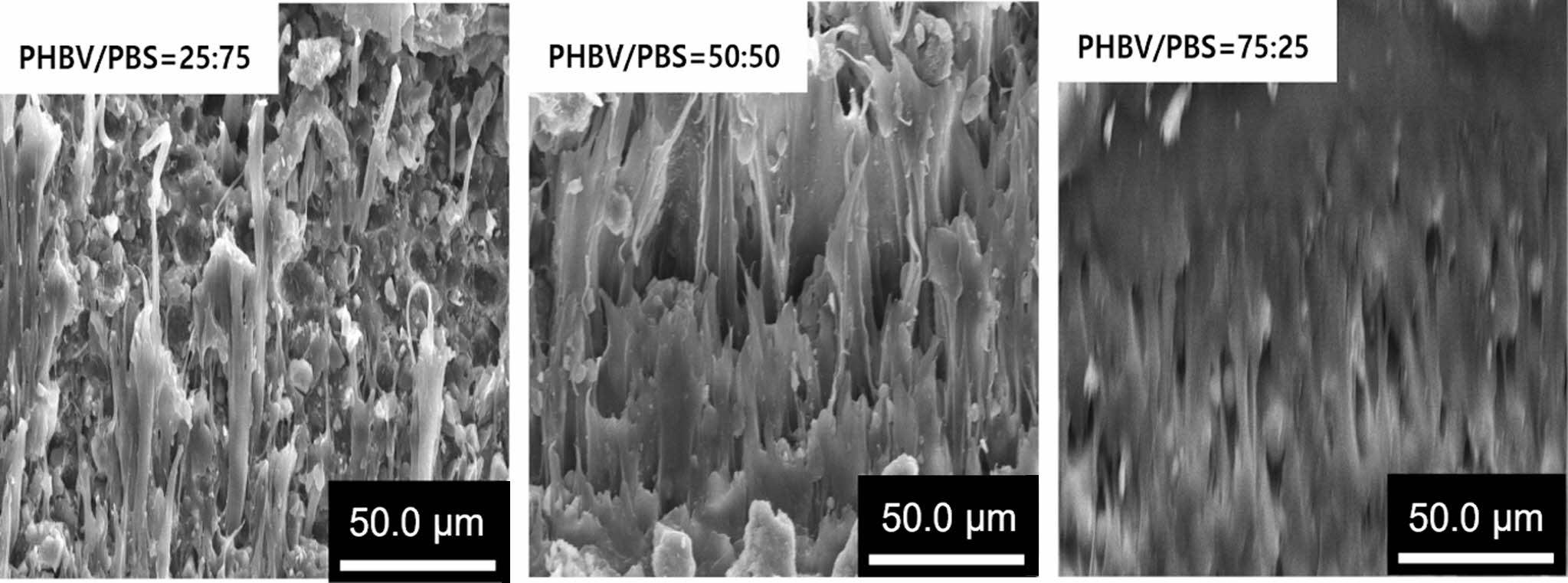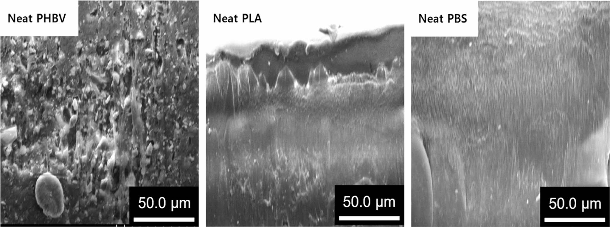 2. PBS는 인장강도 및 탄성계수에는 부정적인 영향을 미쳤으나, 파단신율은 크게 증가시켰다. 이는 PBS의 긴 사슬에 의한 유연성 증가 때문으로 판단된다. 그러나 결정성 고분자인 PBS는 PHBV와의 상용성이 낮아, 블렌딩 시 결정화 억제 및 계면 분리 현상이 관찰되었으며, SEM 이미지에서도 계면 접착력이 낮은 것으로 나타났다.