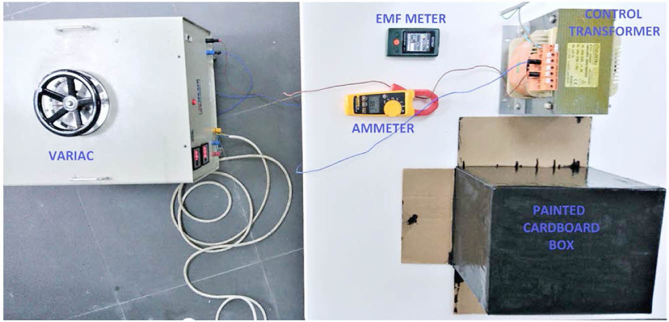 During the testing process, a clamp ammeter is utilized to accurately measure the primary current of the control transformer. The control transformer undergoes testing under both no-load and full-load (1 kW resistive) situations. Conventional cardboard boxes are used to encase the central part of the transformer, which is appropriate for the intended magnetic coating. The EMF meter is situated on both the painted and non-painted boxes that encase the control transformer. Figure 6 illustrates the experimental configuration of the control transformer.