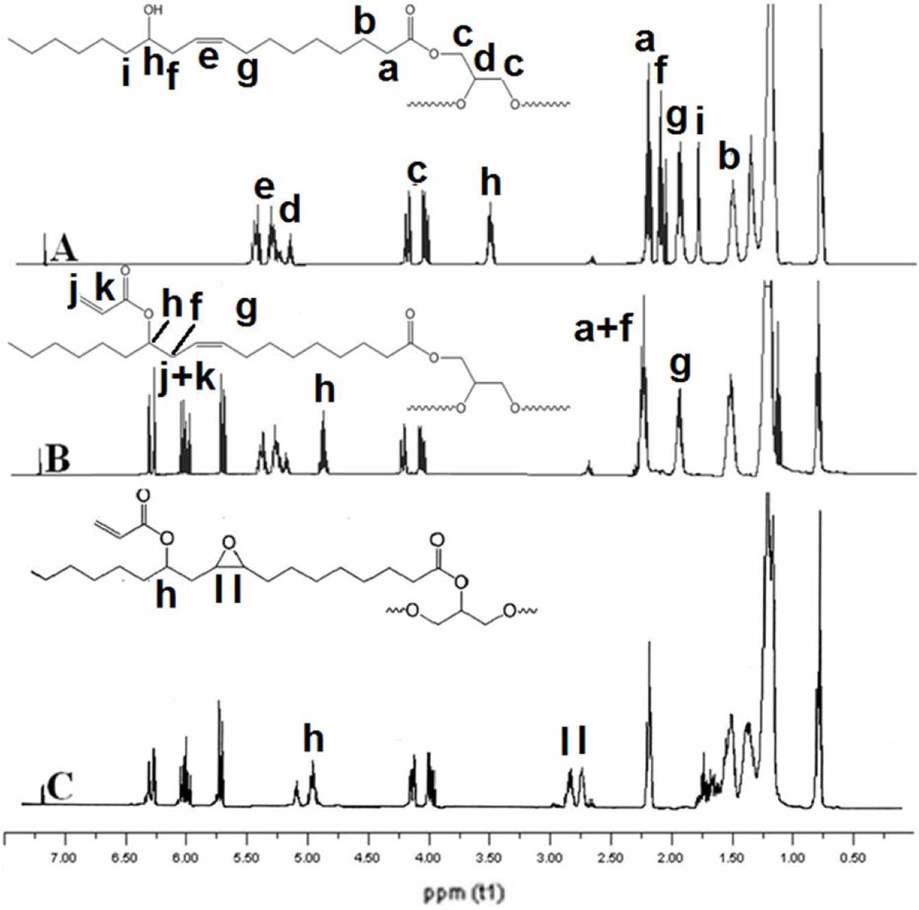 Figure 8 1H NMR spectrum of A-castor oil, B- acrylated castor oil and C-epoxidized acrylated castor oil. |