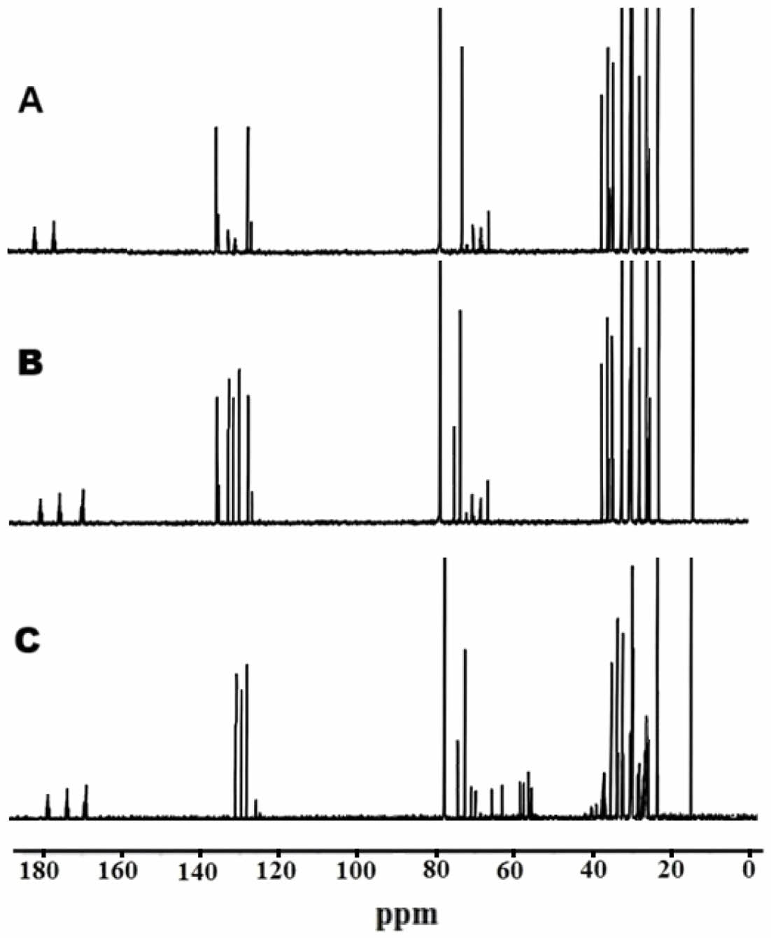 Figure 9 13C NMR spectrum of A-castor oil, B- acrylated castor oil and C-epoxidized acrylated castor oil. |