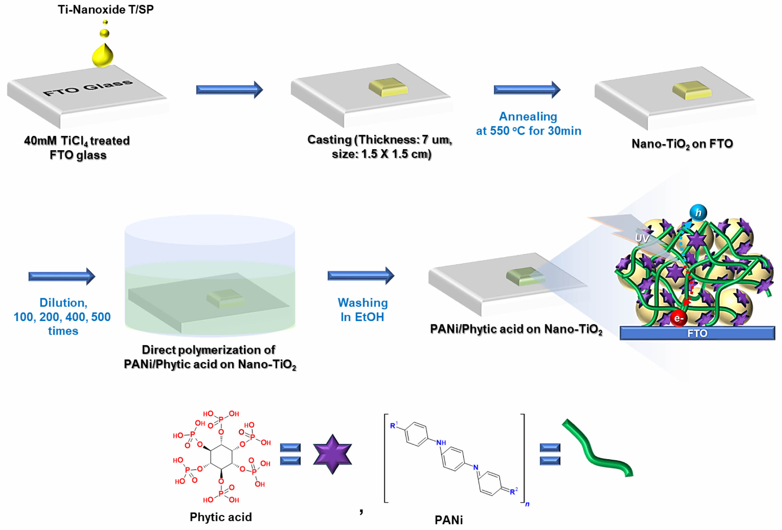 A Nano-TiO2 coated FTO glass substrate was immersed in 5 mL of a reaction solution containing 50 mM aniline monomer and 40 mM phytic acid for 1 h. Subsequently, 0.2 mL of an initiator solution consisting of 125 mM ammonium persulfate was added to the mixture. A color change from brown to dark green was observed within minutes, indicating the successful polymerization of the aniline monomers to form PANi/phytic acid. To achieve a thin layer, the two solutions were diluted 100, 200, 400, and 500 times their original concentrations before performing subsequent experiments. The samples were designated based on the degree of dilution of the reaction solution as follows: Pristine TiO2 (undiluted), 100D Nano-TiO2 (diluted 100 times), 200D Nano-TiO2 (diluted 200 times), 400D Nano-TiO2 (diluted 400 times) and 500D Nano-TiO2 (diluted 500 times).