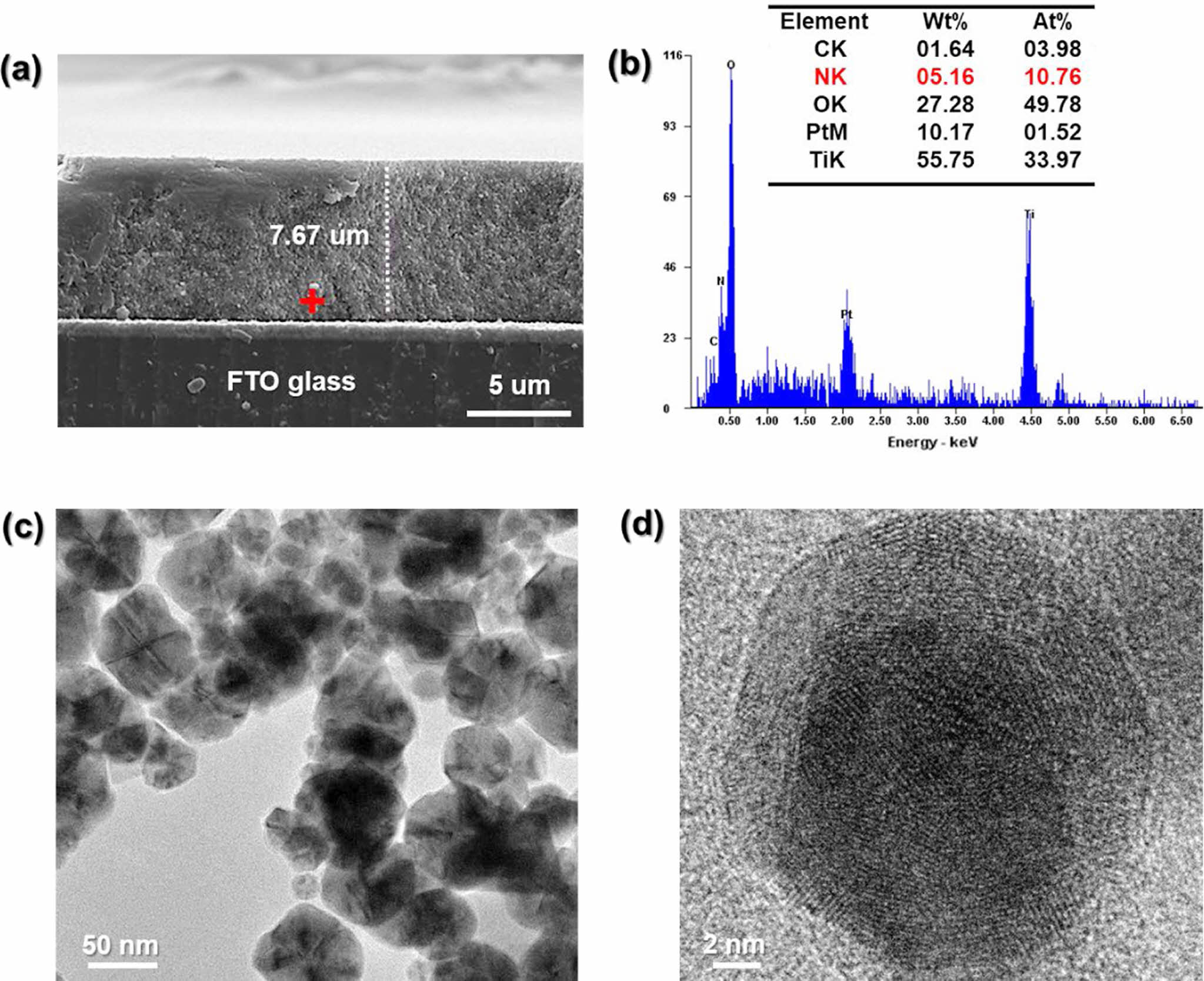 Figure 2 (a) FE-SEM image of cross-section; (b) SEM-EDXA analysis for PANi/phytic acid on nano-TiO2, for PANi/phytic acid on nanoTiO2; (c) and (d) FE-TEM images for pristine Nano-TiO2. |