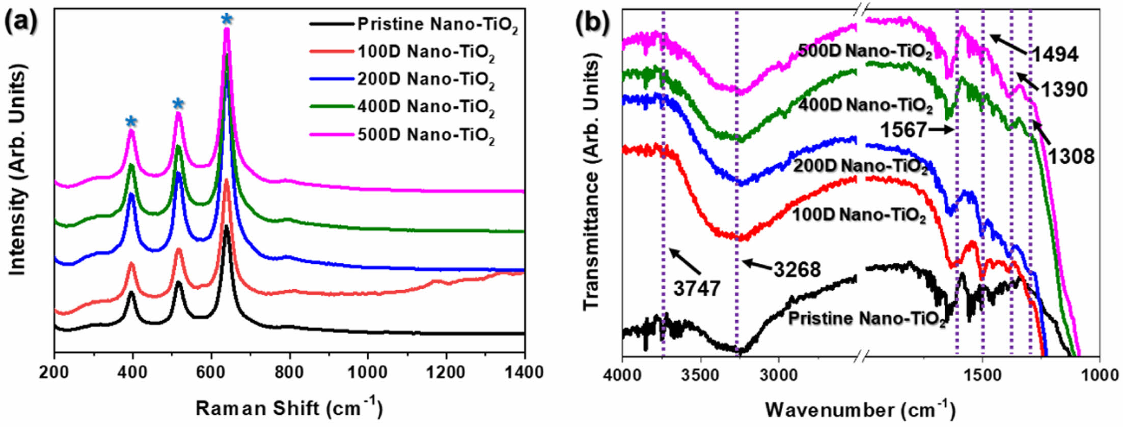 Raman spectroscopy is a critical analytical technique for identifying the crystalline phases of TiO2, and complements XRD in providing a detailed structural analysis. The Raman spectra of the samples, shown in Figure 4(a), exhibit distinct peaks that are characteristic of TiO2. Specifically, the peaks at 395 cm-1, 515 cm-1, and 638 cm-1, marked with blue stars, are attributed to the anatase phase of TiO2, confirming the presence of this highly photo-catalytically active phase in the samples.32,33 Notably, when the degree of dilution of the reaction solution increased, the Raman spectra in the TiO2 peaks remained largely un-changed, indicating that the PANi/phytic acid layer did not interfere with or alter the crystal structure of TiO2. However, the 100D sample displayed significant Raman signal scattering, which was attributed to the deposition of an excessively thick PANi/phytic acid layer on the TiO2 surface, potentially affecting the quality of the signal due to light scattering effects.