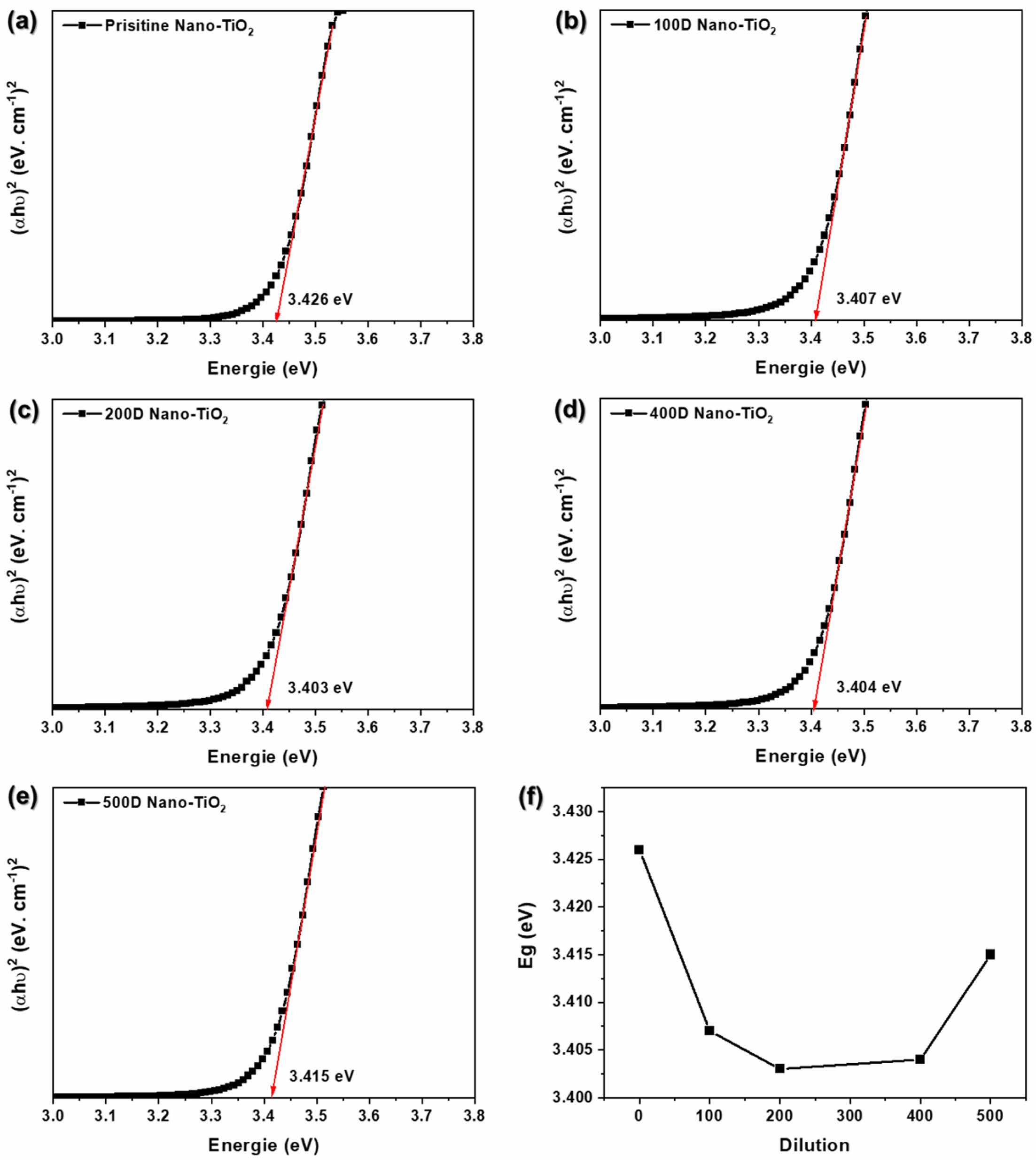 Figure 5 (a) Pristine; (b) 100D; (c) 200D; (d) 400D; (e) 500D for Tauc plot of PANi/phytic acid on Nano-TiO2 electrode; (f) Eg according to various diluted reaction solutions. |