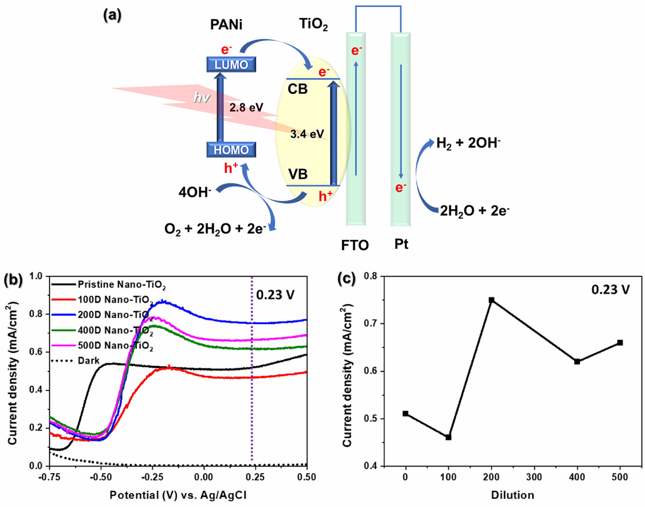 Figure 6 EC characterization of PANi/phytic acid on Nano-TiO2 electrodes prepared using various di-luted reaction solutions: (a) reaction route of UV-vis light absorption and charge transfer in PANi/phytic acid on Nano-TiO2 for photoelectrochemical water splitting; (b) I-V curves recorded at a scan rate of 10 mV/s under illumination (AM 1.5G, 100 mW/cm2); (c) current density at 0.23 V vs. Ag/AgCl. |