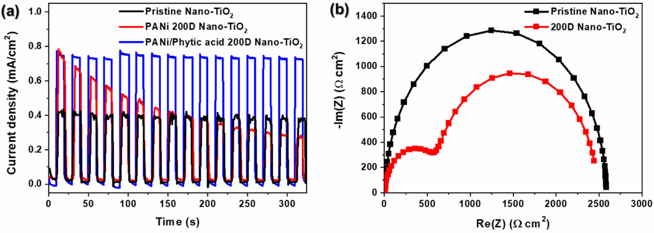 Figure 7 (a) I-t curve recorded at 0.23 V vs. Ag/AgCl under illumination with alternating 10 s light and dark cycles for pristine nano-TiO2, PANi and PANi/phytic acid on Nano-TiO2 prepared under optimal dilution; (b) nyquist plots of pristine and 200D Nano-TiO2 at open circuit potential un-der illumination. |