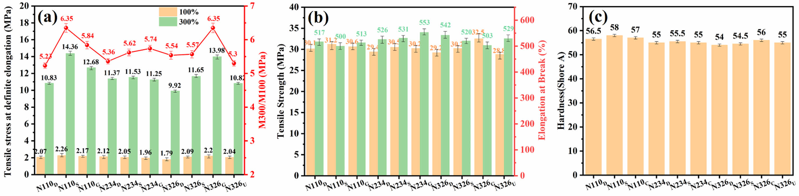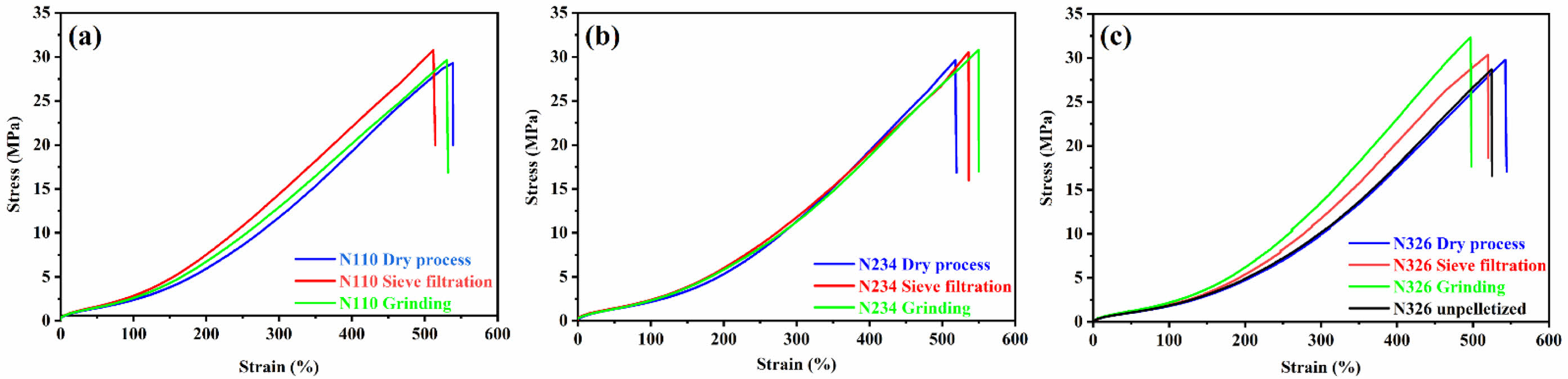 Figure 3 presents the stress–strain curves of rubber composites reinforced with N110 (Figure 3(a)), N234 (Figure 3(b)), and N326 (Figure 3(c)) carbon blacks, respectively. In the initial stage of tensile testing, the rubber composites exhibited an approximately linear relationship between stress and strain.26