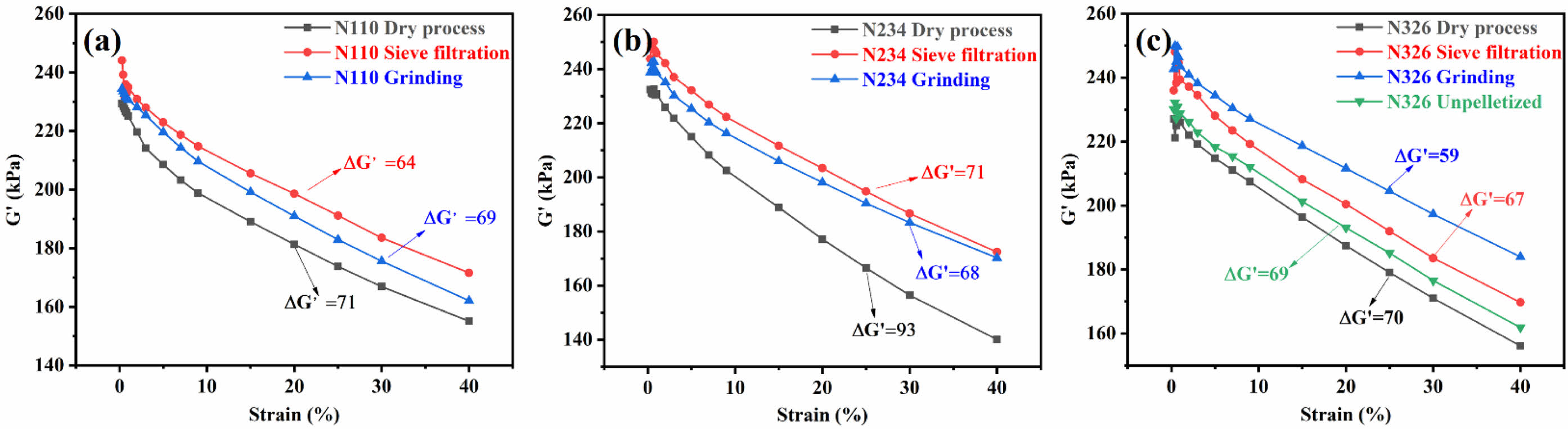 As shown in Figure 4(a), for N110 carbon black, the magnitude of the Payne effect followed the order: N110 dry process > N110 grinding > N110 sieving filtration. This trend can be explained by the inherently small particle size of N110 carbon black, which limited the particle size reduction achieved through grinding. Additionally, grinding hindered dispersion in the wet process. In contrast, sieving filtration carbon black benefited from improved dispersion, leading to a lower ΔG′ and better filler distribution.