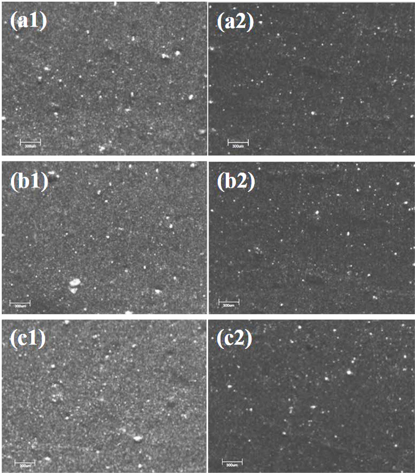Figure 5 Carbon black dispersion of CB/NR composites prepared by wet method and dry method: N110-Dry process (a1) and N110-Wet sieve filtration (a2), N234-Dry process (b1) and N234-Wet sieve filtration (b2), N326-Dry process (c1) and N326-Wet sieve filtration (c2). |