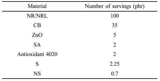 Mixing and Vulcanization: Dry mixing process: The natural rubber is put into the internal mixer, and CB, ZnO, SA and antioxidant 4020 are added after 1 min. The temperature reaches 145 ℃ after 5 min. The total mixing time is 5 min. After discharging the rubber, the accelerator NS and sulfur are added to the master batch on the open mill.