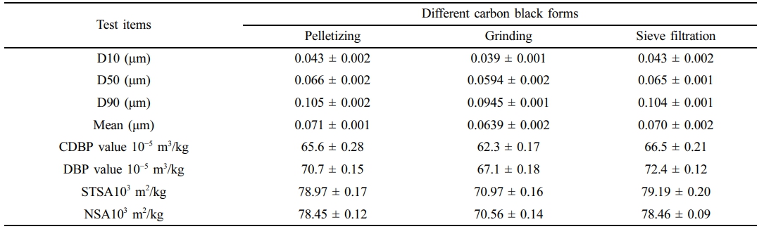 Testing and Characterization. Carbon Black Performance Analysis: The particle size, specific surface area and structure of carbon black were related to the performance of carbon black filled rubber. The particle size was determined by the nitrogen adsorption specific surface area method, the structure was characterized by the compression oil absorption value, and the particle size distribution was determined by a disc type centrifugal sedimentation meter. The total specific surface area of carbon black (NSA). The external specific surface area of carbon black (STSA). Oil absorption value (DBP) indicates the sum of the primary structure and secondary structure of carbon black. The primary structure of carbon black (CDBP). D10 indicates that the particle size of carbon black below 10% was less than this value. D50 indicates that the particle size of carbon black below 50% was less than this value. D90 indicates that 90% of the carbon black particles were smaller than this value.