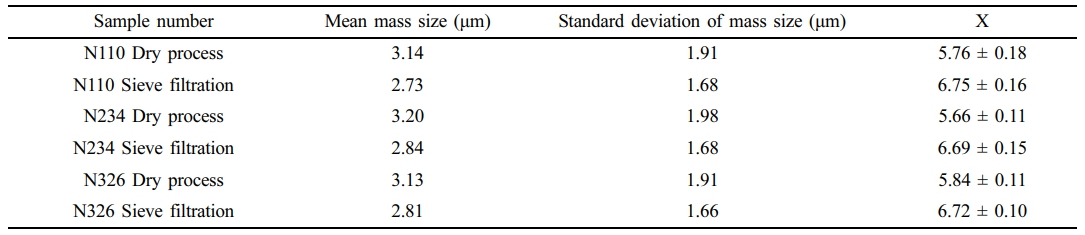According to the data presented in Table 4, the agglomerated particle size in rubber prepared via the wet mixing process was generally smaller than that of the corresponding dry process. This finding demonstrates that the wet mixing method provides improved dispersion of carbon black within the rubber matrix.29