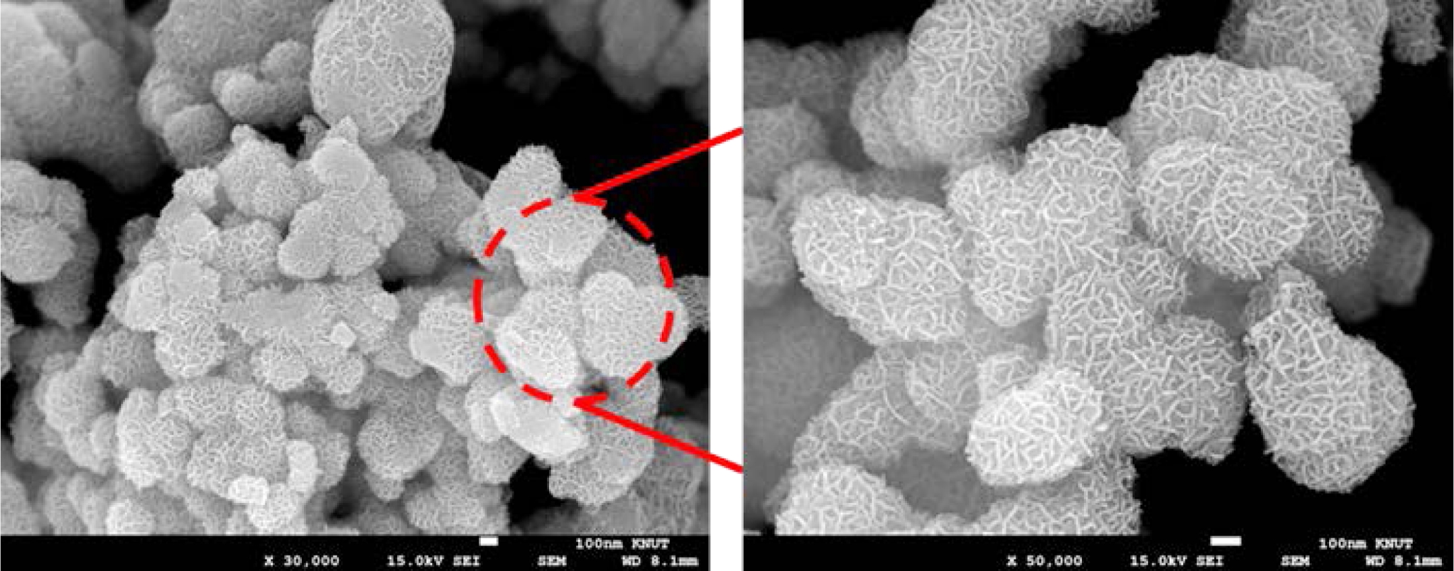 Morphology Analysis. To synthesise the manganese dioxide nanoflowers, initially the redox chemistry was applied. When oxidised by potassium permanganate, manganese chloride can generate different phases. In this case, potassium permanganate first gets reduced in acidic medium to form Mn2+. This phenomenon happens through an intermediate phase (MnO3)2-SO4. Then this Mn2+ is combined with the Mn source of manganese dichloride tetrahydrate to form MnO2.27