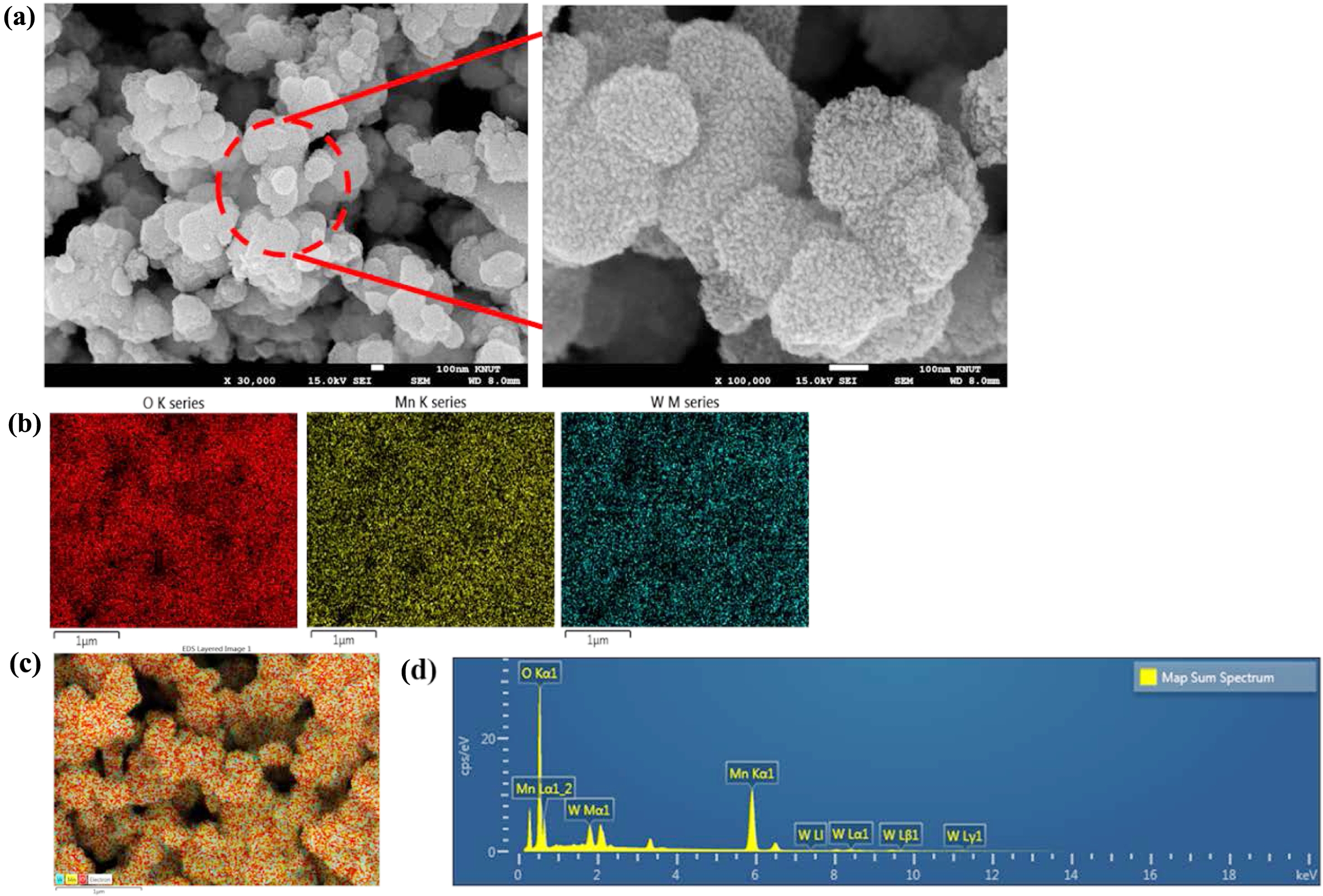 Figure 2 (a) FESEM of W-MNF-0.3060 at different magnification level; (b) EDS mapping of different atoms; (c) merged image; (d) EDS analysis. |