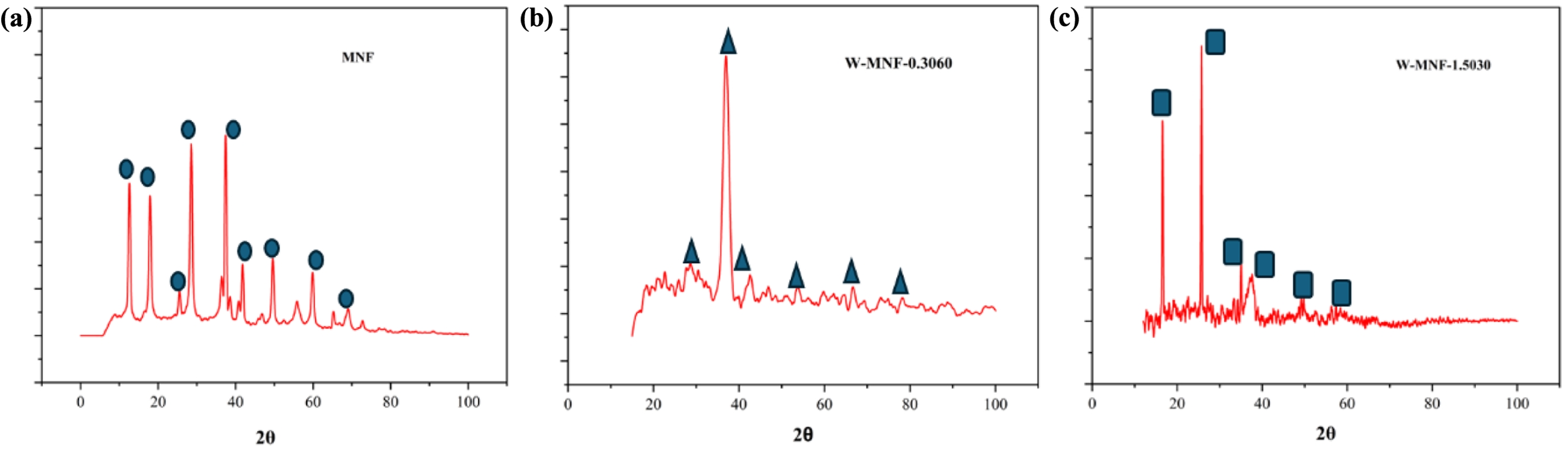 Figure 4 XRD peaks of (a) MNF; (b) W-MNF-0.3060; (c) W-MNF-1.5030. All the major peaks are noted with respective shapes which are included in the graphs. MNF was matched with PDF 00-44-0141, W-MNF-0.3060 was matched with PDF 01-074-6605, PDF 01-078-6777 and PDF 01-082-0728 and W-MNF-1.5030 was matched with PDF 01-086-0134 and PDF 01-084-0886. |