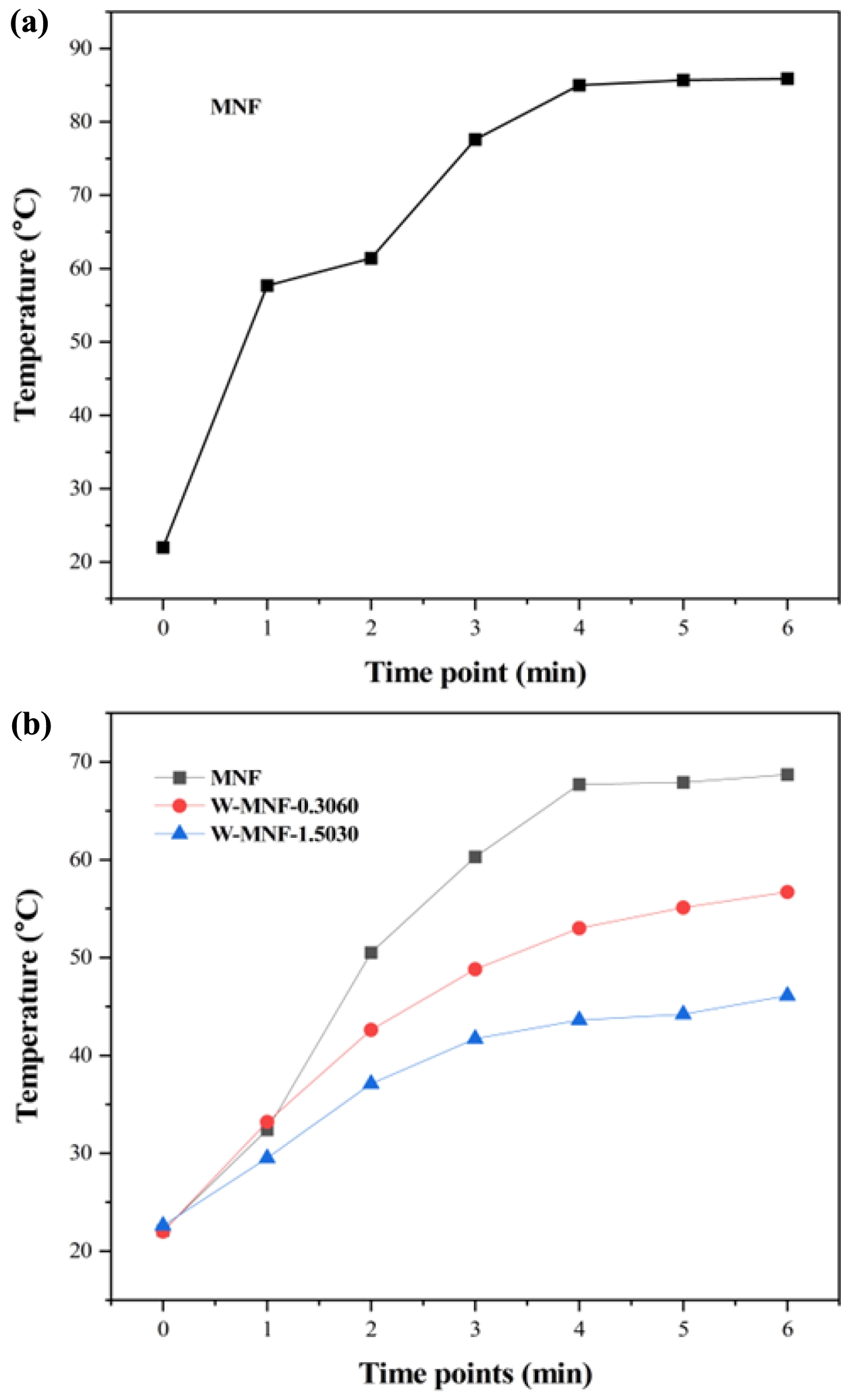 Figure 6 Photothermal experiments to monitor Tmax: (a) pristine MNF with 1 mg/mL concentration and 3 W/cm2 laser power for determining the initial constraints; (b) MNF, W-MNF-0.3060, and W-MNF-1.5030 with 500 μg/mL concentration and 2.1 W/cm2 , laser power. |