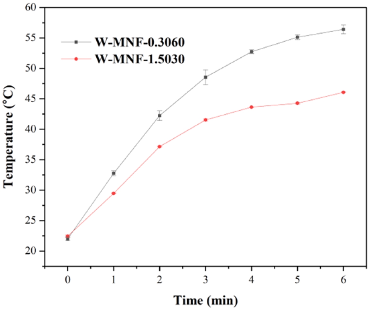 Photothermal Experiment Under NIR Laser. MNF and W-MNFs were dissolved in DPBS with different sample concentration and irradiated with 808 nm laser with different power and time. Temperature was recorded at a predetermined interval and plotted.