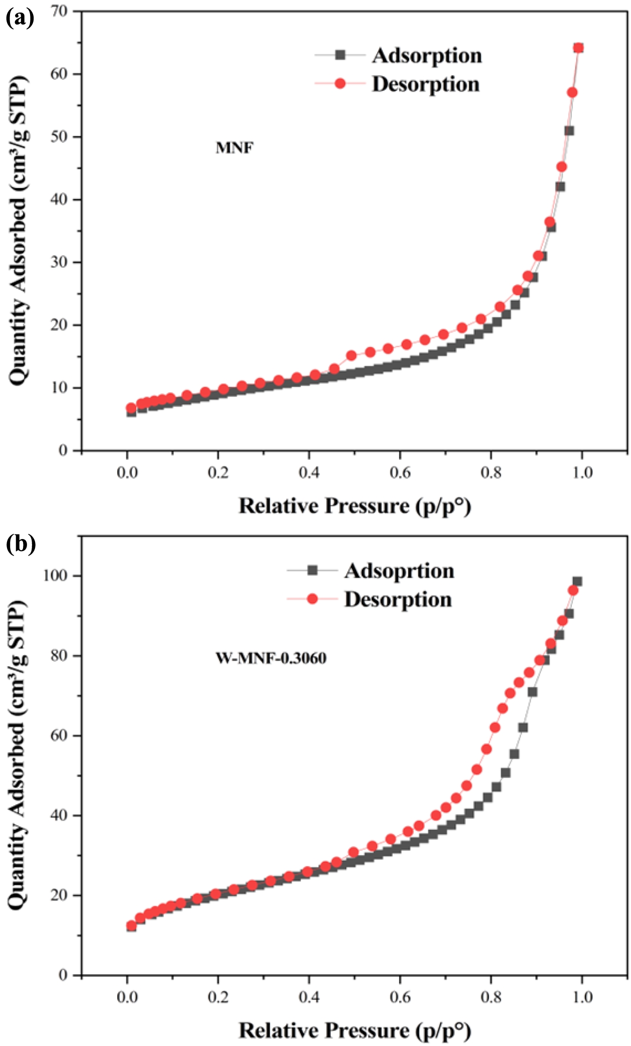 pristine MNF and W-MNF-0.3060 showed a type IV(a) isotherm consistent with a mesoporous material where the pore diameter lies in the range of 2-50 nm. The hysteresis loop is inconsistent in both structures. The MNF exhibits H3 type loops which implicate the simpler mesoporous structure whilst the W-MNF-0.3060 shows a H4 type of loops where it suggests that doping has altered the network connectivity significantly and by which introduced a mixture of narrow mesopores (Figure 8). The BET surface area plot revealed the surface area increase from pristine MNF to doped MNF. The BET surface area was calculated (Figure 9) from the 1/[Q(p0/p-1)] vs. relative pressure (p/p0) plot of MNF, which was found to be 32.4775 ± 0.0997 m2/g whilst the for W-MNF-0.3060 showed 72.6977 ± 0.1423 m2/g (in both cases the R2 value was found to be 0.99954 and 0.99997). This significant increase of surface area can partially explain the PTT ability of these two materials. As for doped structure, the active surface area increased significantly which in terms can dissipate the light energy significantly, that in turns lower the generated heat amount. Finally, the pore structure was assessed by adsorption-desorption dV/dD pore volume plot against pore diametre for both MNF and W-MNF-0.3060 (Figure 10, 11). For adsorption-desorption case, pristine MNF showed single sharp peak at mesoporous region whilst the later one showed a broad peak at mesoporous region for adsorption and for desorption mixed peaks were exhibited ranging micropore-mesopore region. This later phenomenon can be described by an array of things such as pore blocking, capillary condensation.31