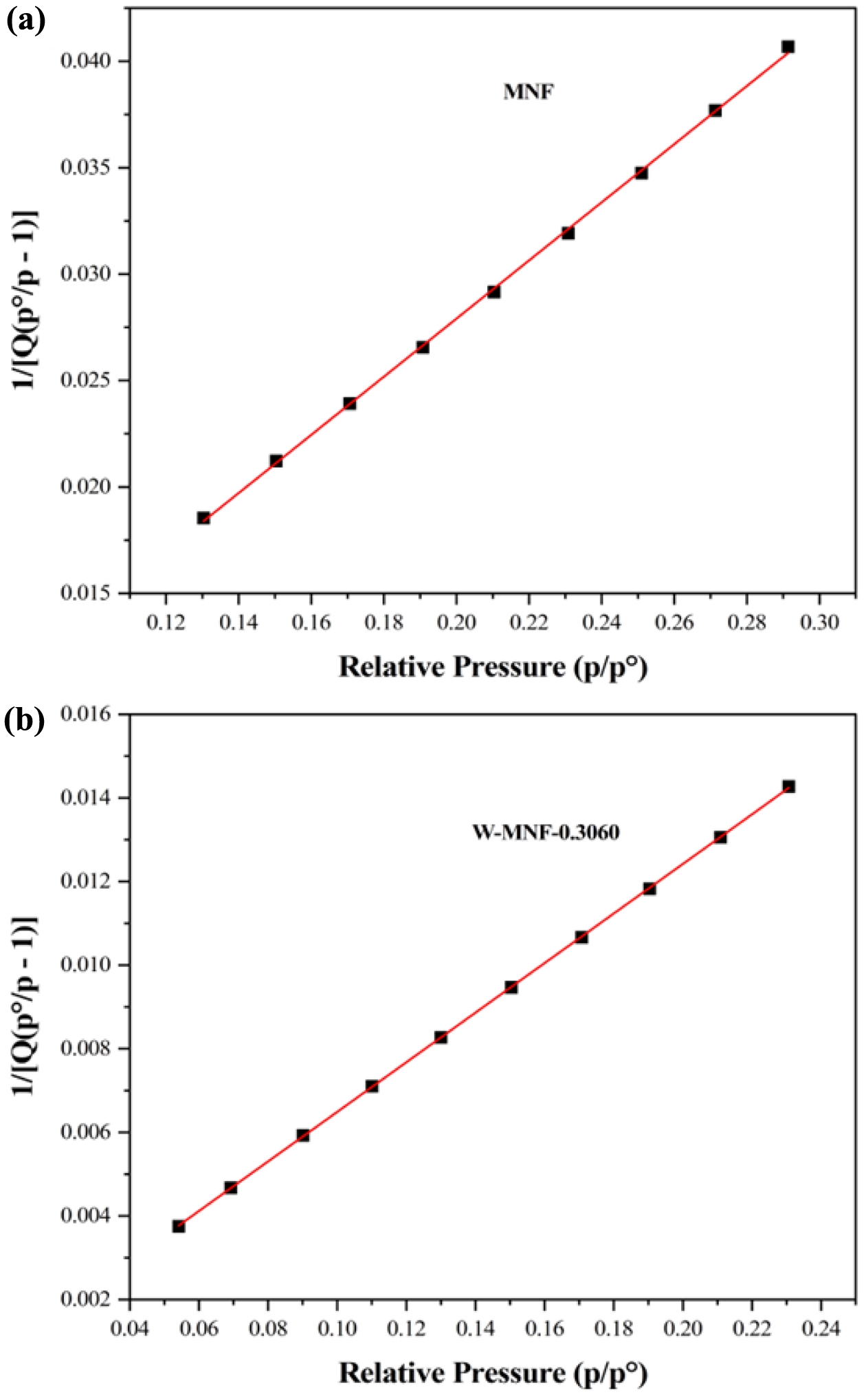 Figure 8 Isotherm linear plot: (a) MNF; (b) W-MNF-0.3060. |