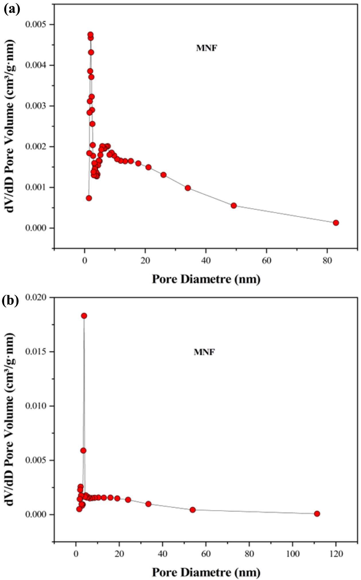 Figure 10 (a) adsorption; (b) desorption dV/dD pore volume vs. pore diametre plot for MNF. |