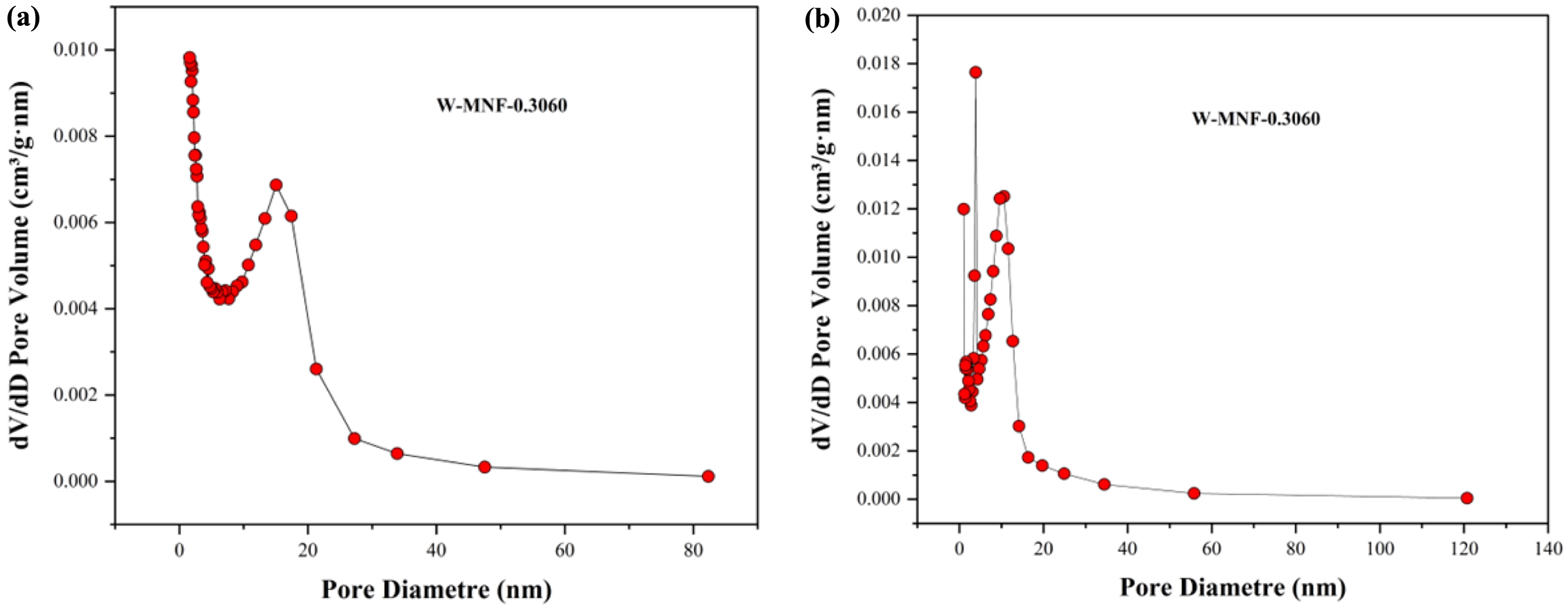Figure 11 (a) adsorption; (b) desorption dV/dD pore volume vs pore diametre plot for W-MNF-0.3060. |