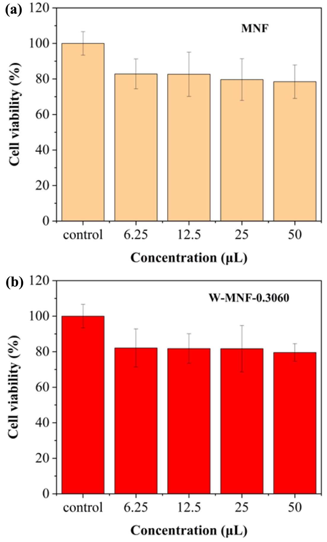 Figure 13 Cytotoxicity profiles of (a) pristine MNF; (b) W-MNF0.3060 at different concentrations and data expressed in ± standard deviation. The experiment was repeated thrice (n=5). |