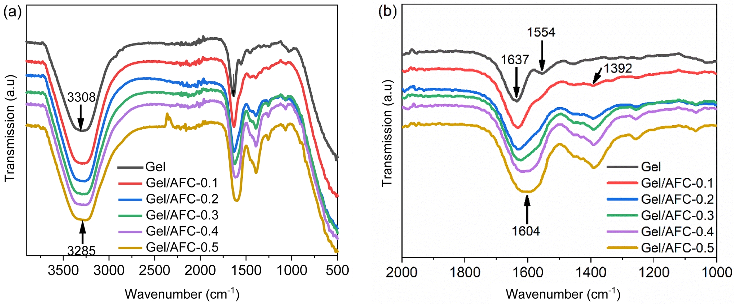 Molecular Interactions in Gel/AFC-x Composite Hydrogels. The FTIR spectra of gelatin and immersed hydrogels are shown in Figure 2. It can be seen that three main characteristic peaks locate at 3308 cm-1, 1637 cm-1, and 1554 cm-1 in the gelatin hydrogel. The broad characteristic peak that appeared at 3308 cm-1 was associated with the stretching vibration overlap of -NH and -OH groups, suggesting the existence of a large number of hydrogen bonds in the gelatin hydrogel. In addition, the characteristic absorption peak at 1637 cm-1 belonged to the amide I band, corresponding to the stretching vibration of C=O in gelatin, while the characteristic absorption peak at 1554 cm-1 was assigned to the amide II band, attributing to the bending vibration of N-H groups.