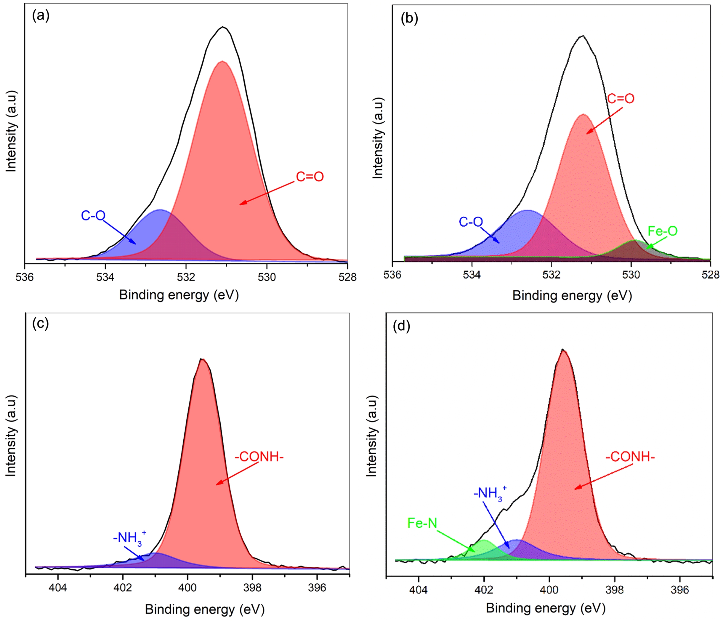 Figure 3 The high-resolution XPS spectra: (a) O 1s; (c) N 1s in gelatin films; (b) O 1s; (d) N 1s in Gel/AFC-0.5 films. |