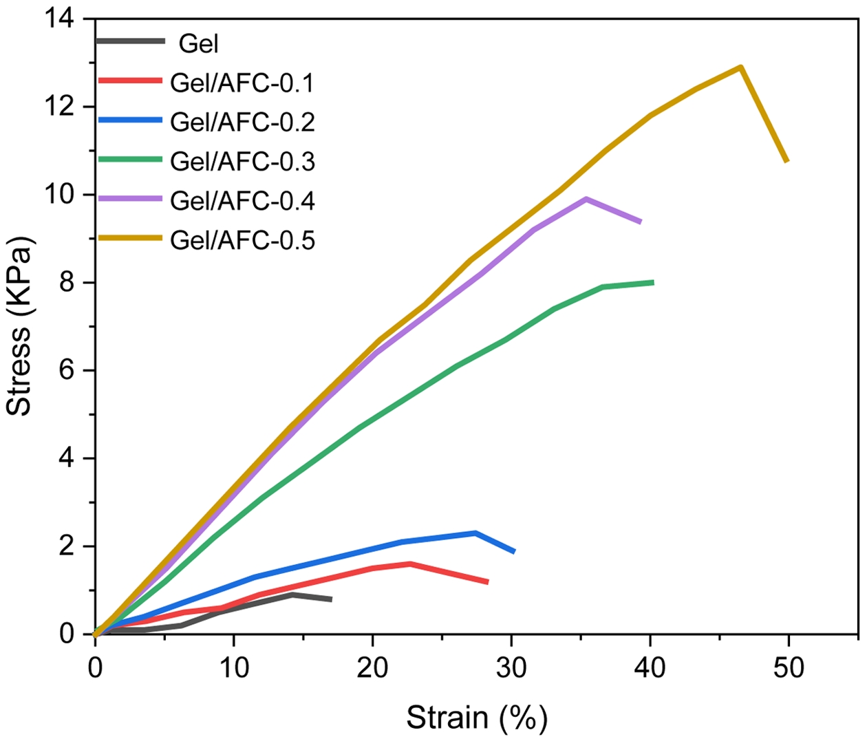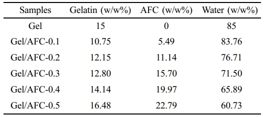 The component content of Gel/AFC-x hydrogels is displayed in Table 1. With an increase in the concentration of immersion solutions, the AFC content of hydrogels increased continuously and the gelatin content showed a similar change. On the contrary, the water content decreased with an increase of AFC solution concentration. This may be due to the absorption and swelling of the AFC solution. Similar results have been observed in the immersion of gelatin hydrogels in K3Cit solutions.20