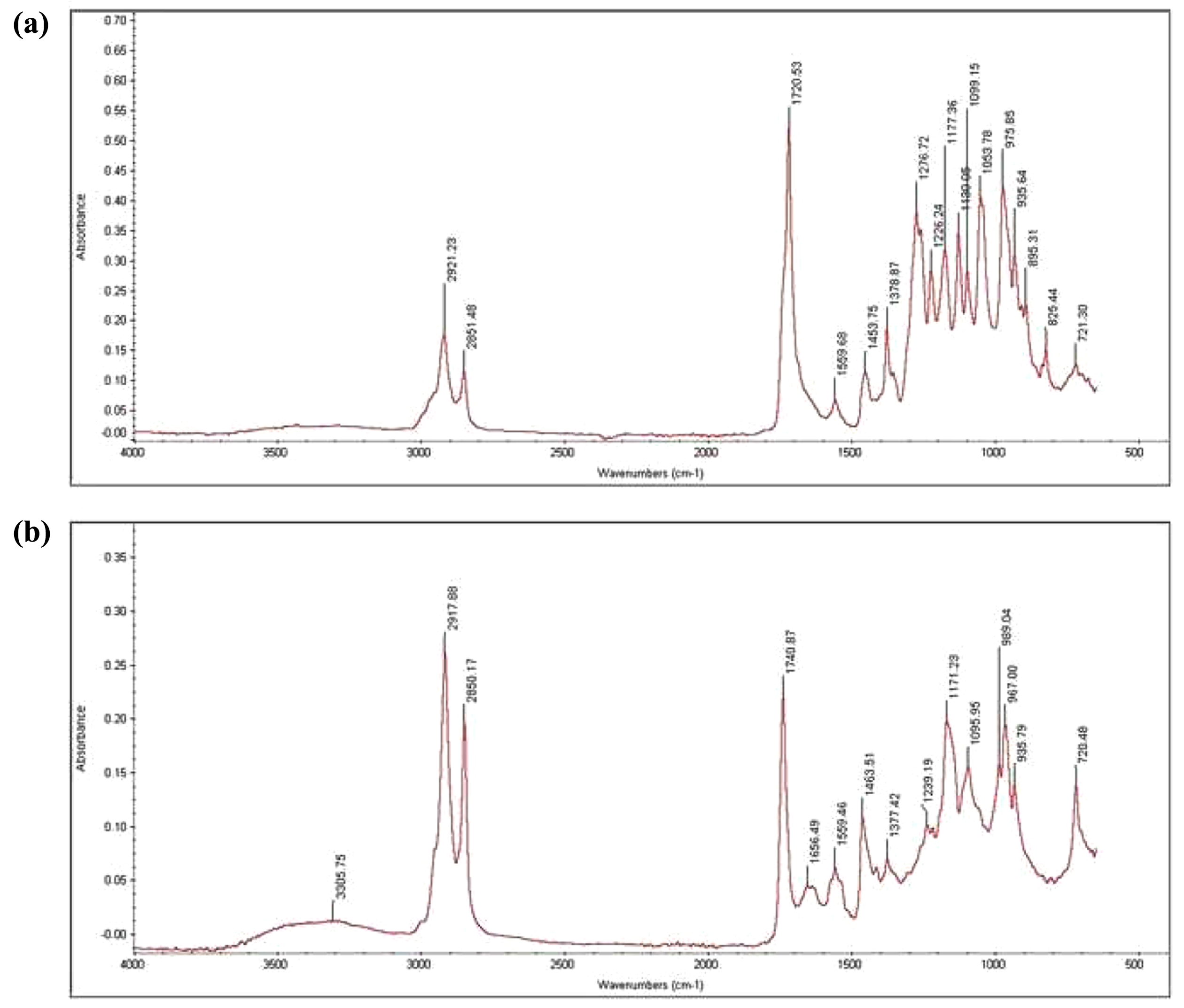 Figure 2 FTIR spectrum showing an intense peak at 1722 cm-1 and some stretches in range of 1330-1200: (a) FTIR spectra of standard PHA (Sigma Aldrich); (b) FTIR spectra of PHA produced by BM2. |