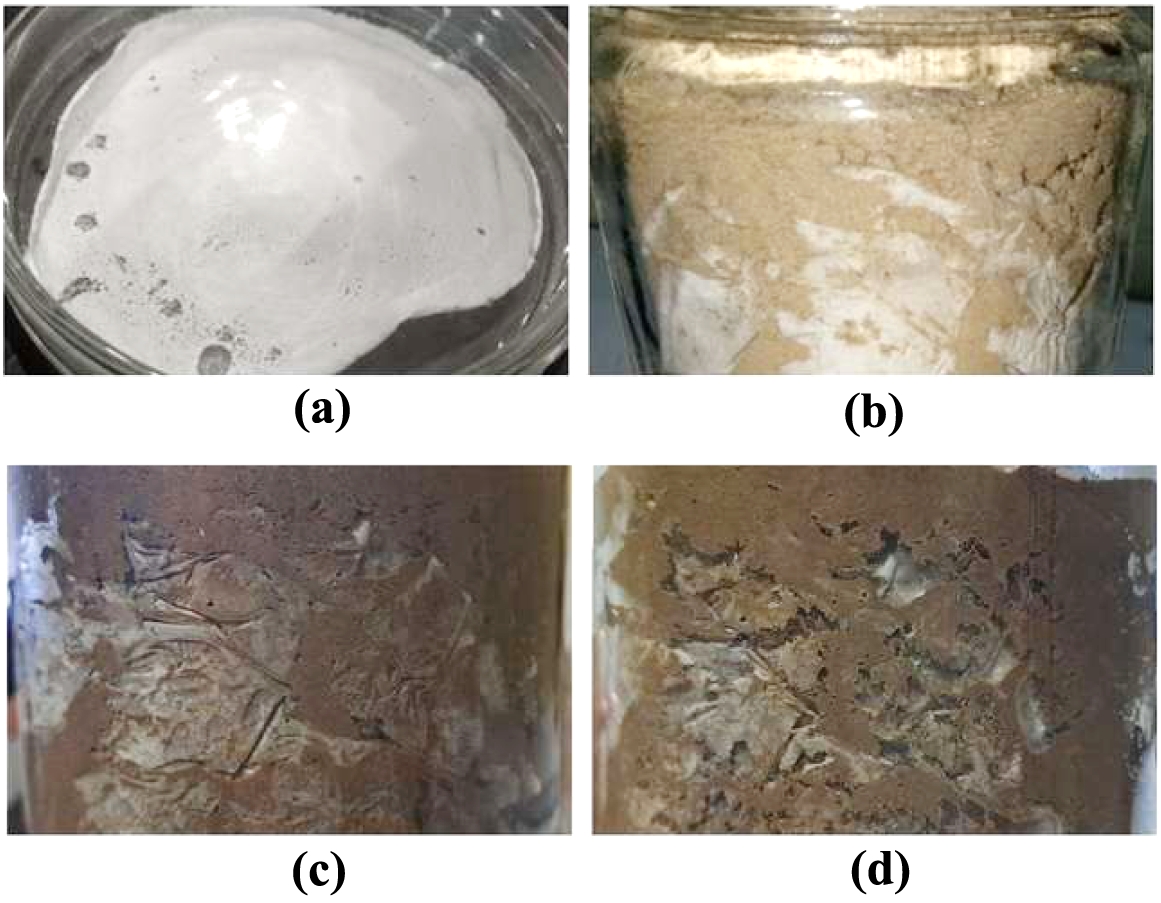 Degradation experiments were performed under natural conditions in garden soil. Garden soil was poured into a clean glass jar. PHA specimens were weighed and buried along with the same-sized petro plastic (polyethylene) deep in the soil (Figure 3(a) and 3(b)). Specimens were observed at time intervals. Initially, the degradation of PHA was a slow process due to an environment with low microbial activity. Considerable degradation was observed in 2 weeks (Figure 3(c)) while major part was degraded after 30 days (Figure 3(d)).
