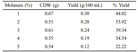 The highest PHA yield was observed (around 53.92%) by using NB medium supplemented with 2% molasses and around 30% by using glucose. Tajima et al., 2003 has also reported a very close yield of PHA by using other B. megaterium strain in glucose supplement medium. Analysis of the data showed that NB is more suitable medium compare to the MSM medium if supplemented with the above mentioned waste food supplement (Tables 1-2).Studies have shown that the production of PHA by Alcaligenes eutrophus in a synthetic medium has produced highest yield at 3% glucose supplemented medium.