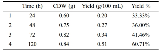 PHA extraction was also carried out for different time intervals such as 24, 48, 72, and 120 h using NB supplemented with food waste oil (100 µL). It gave 33.33%, 36.00%, 41.46%, and 60.71% yield at 24, 48, 72, and 120 h respectively (Table 5).