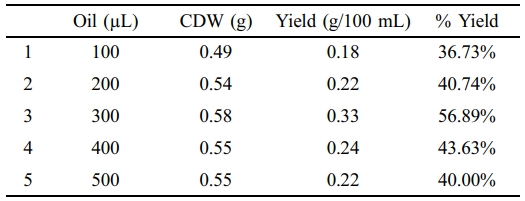 NB was supplemented by using different concentrations of wasted food oil from 100 µL to 500 µL. Among them, the highest yield of PHA was at 300 µL of waste edible oil, which was 56.89% (Table 6). It was observed that after increasing the concentration of waste food oil, the percentage yield also increased. After increasing 300 µL to 400 µL of oil, the percentage yield decreased.