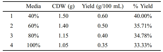 Pre hydrolyzed wasted potato was synthesized and used with NB (40, 60, 80, and 100%) supplemented with 300 µL of wasted edible oil. 40, 35.71, 34.78, and 33.33% PHA production were calculated at 40, 60, 80, and 100% of pre hydrolyzed media respectively. Calculations revealed minimal variation in percentage yields across various hydrolyzed medium and NB concentrations (Table 7).