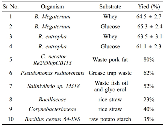 Highest yield of PHA was observed by using 3% fatty acid supplement in NB medium whereas molasses provided highest yield (53.90%) at 2% supplement in NB.46 Studieshave reported PHA production by using different wasted frying oil as carbon source for C. nector.47-49
