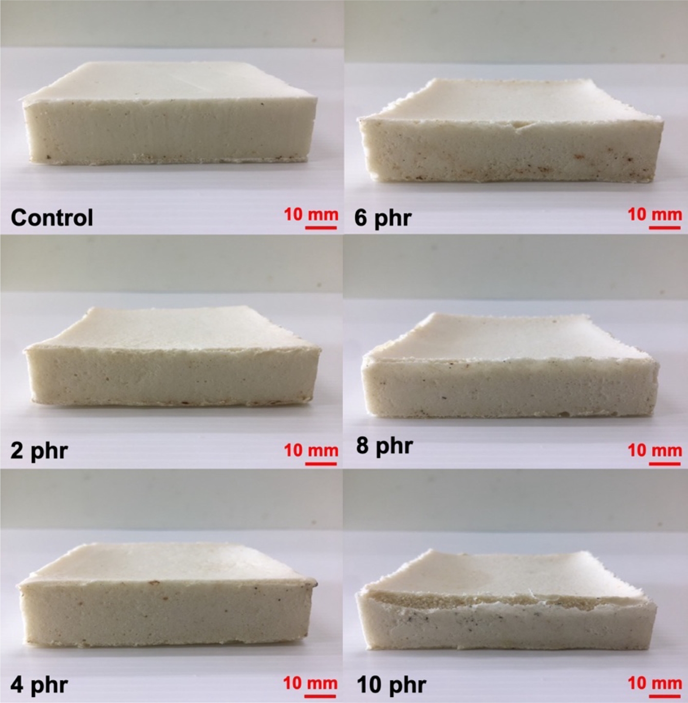 Figure 1 Physical appearance of the NR latex foam samples prepared at various Triclosan content. |