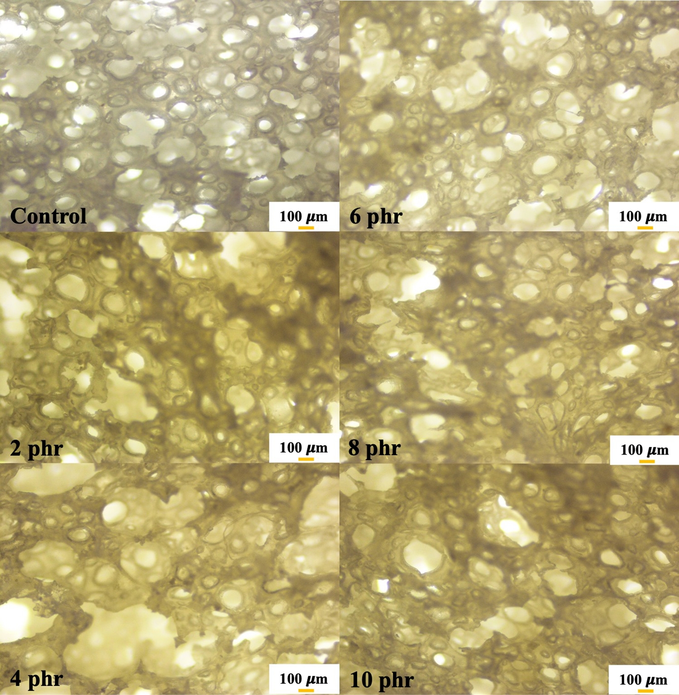 Figure 2 Optical images at 40× magnification NR latex foam samples prepared at various Triclosan content. |