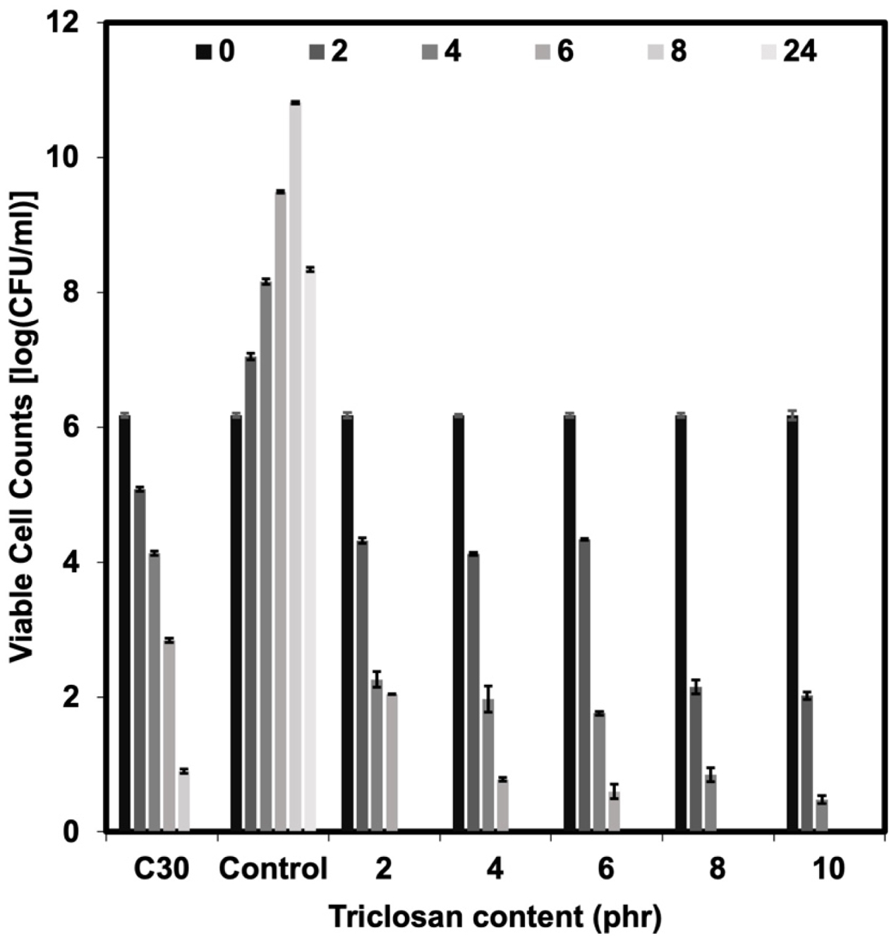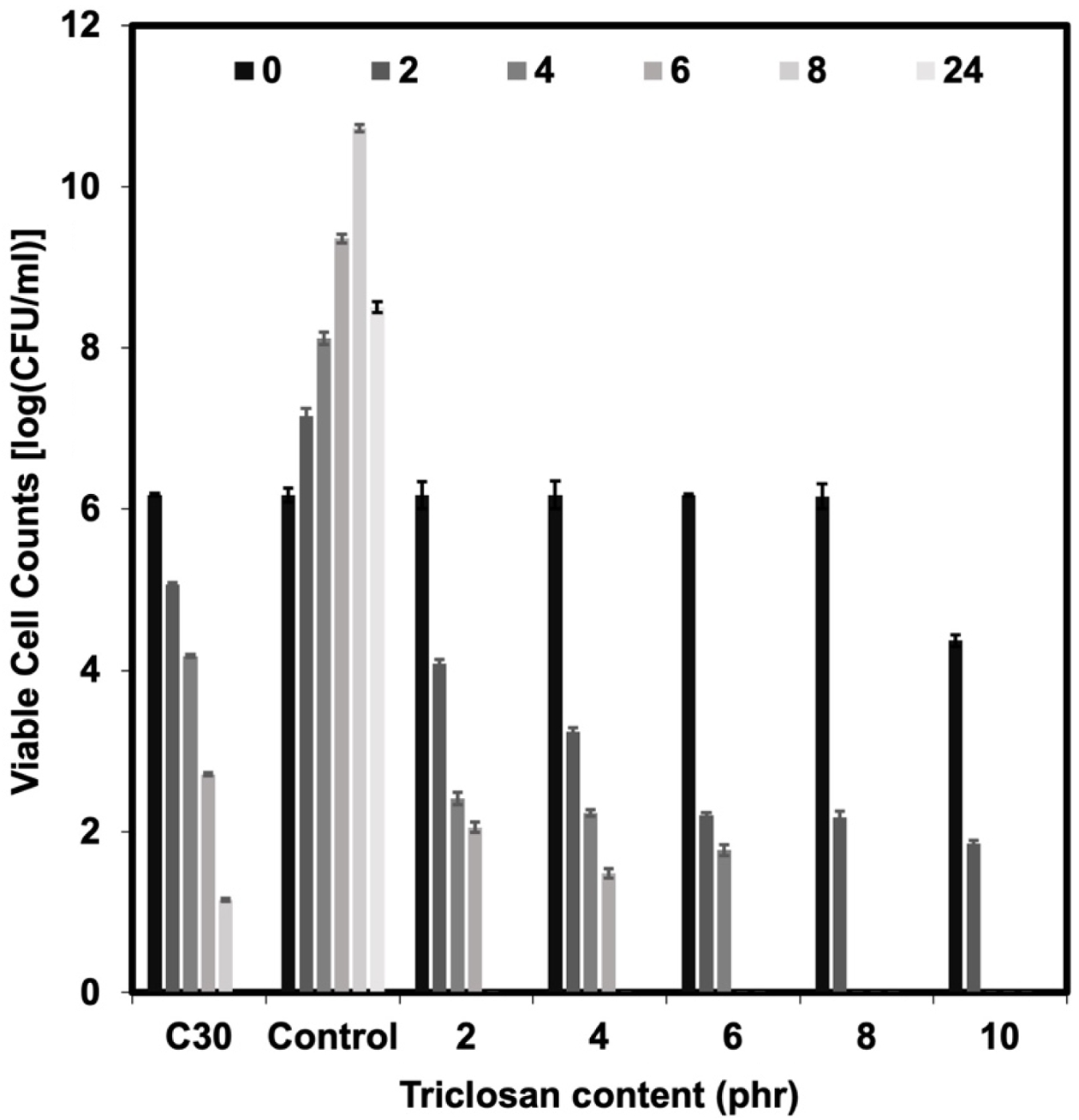 Figure 4 Viable cell counts against E. coli of Chloramphenicol and the NR latex foam samples prepared at various triclosan content. |
